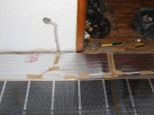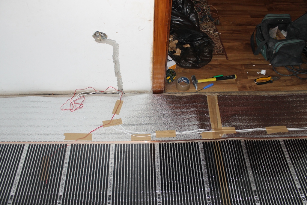 In areas where we cut the film, you need to isolate the middle bus with bitumen insulation, which, as a rule, comes with a warm floor. Be sure to ensure that the insulation completely covers the silver contacts of the system, which interconnect the copper bus and carbon heaters.