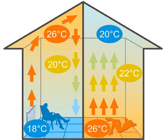 - Infrared constructions can boast of the fact that they heat the room evenly along the whole height. At the same time, the optimum level of comfort is achieved precisely in the lower part of the space.