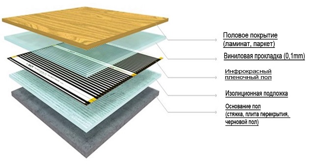 As described above, the infrared floor consists of a special film with heating strips, securely fixed in it. Heating of the strips occurs due to the supply of electricity through the conductors of copper and silver. Special carbon fiber paste is always applied to the top of the film, which is the direct recipient of the required heat energy.