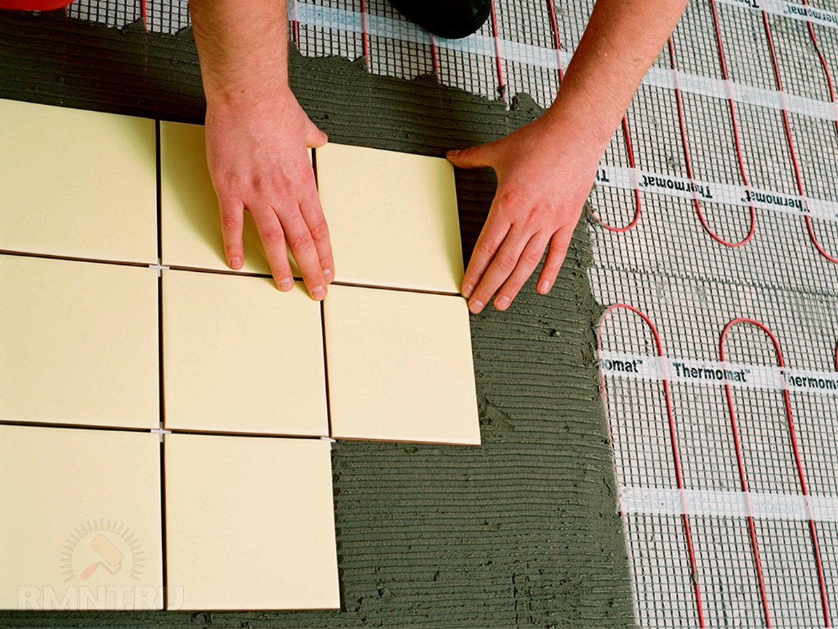 - Making sure that the system is working properly, you can begin to lay tiles. Experts recommend applying a heat-resistant tile adhesive to the entire surface of the floor that will withstand high temperatures. It is enough that a layer of glue covers the gaps between the cable. Laying tiles produced by standard technology directly on the surface of the heating mat (without screed).