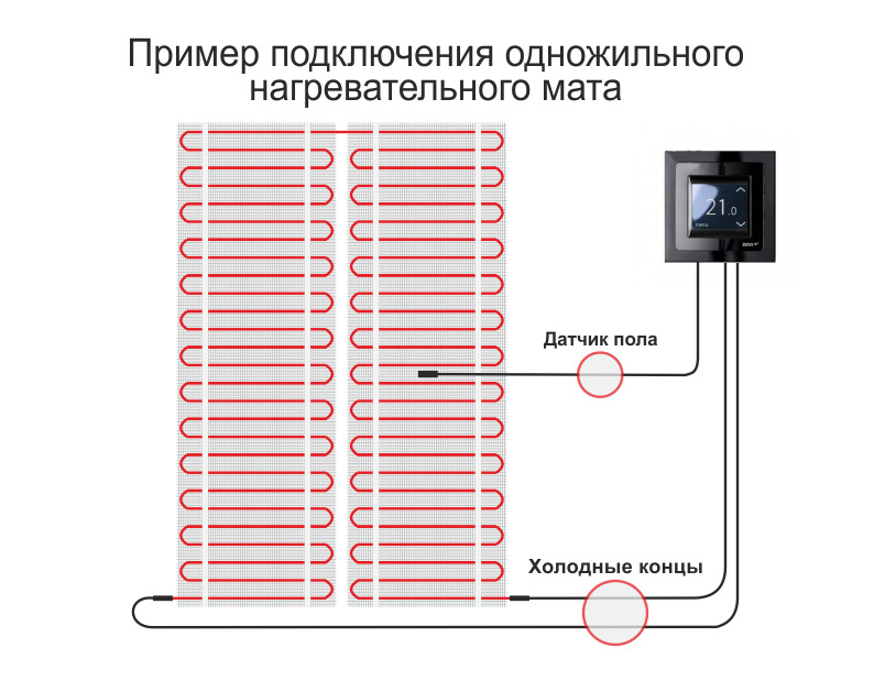 - Single core consists of one heating conductor that causes some inconvenience during installation. Cloth mat must be deployed on the area of coverage so as to bring the end of the cable back to the thermostat. Single-core mats have a high degree of electromagnetic radiation, so it is recommended to lay them only in rooms where they do not spend much time. This can be a bathroom or a corridor.