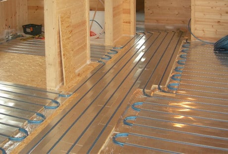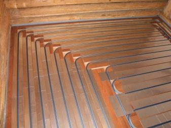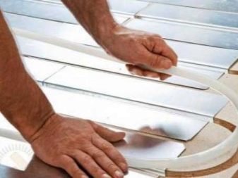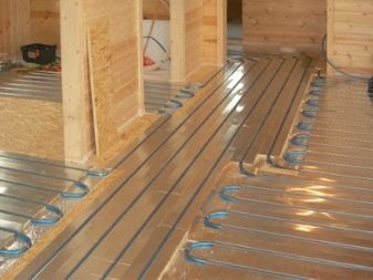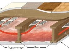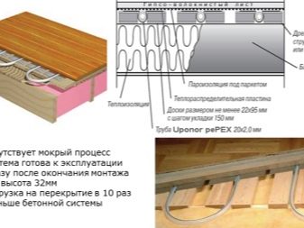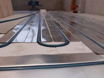 As a rule, the plates “take” 30 mm of height, and if they are laid directly on the beams, then its loss will be zero. The heat exchanger of the plates is placed between the "rough" base and the leveling sheets, the pipes are inserted into special grooves, then the finishing floor is mounted.