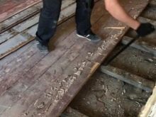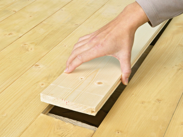 Before starting the dismantling of the board, it is necessary to mark them with an indication of their order and orientation, as in the case of using tongue-and-groove boards or with a spike-groove attachment, an error in orientation will disturb their mutual fixation. The indication of the top side will be the surface on which the marking is applied.