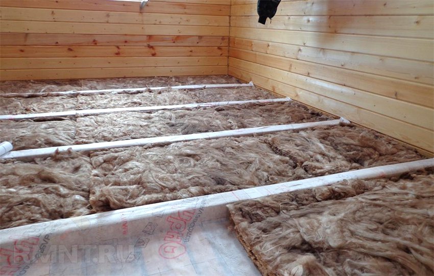 After that, you need to start installing the insulating material in the intervals between the lags. If possible, the heat insulator fragments should be cut so that there is no unnecessary gaps between them and the lags, and the insulation itself does not fall out. If necessary, if the fragment does not stick to the edges with lags, it can be temporarily fixed with screws, and the gap between its edges and lags can be filled with mounting foam.
