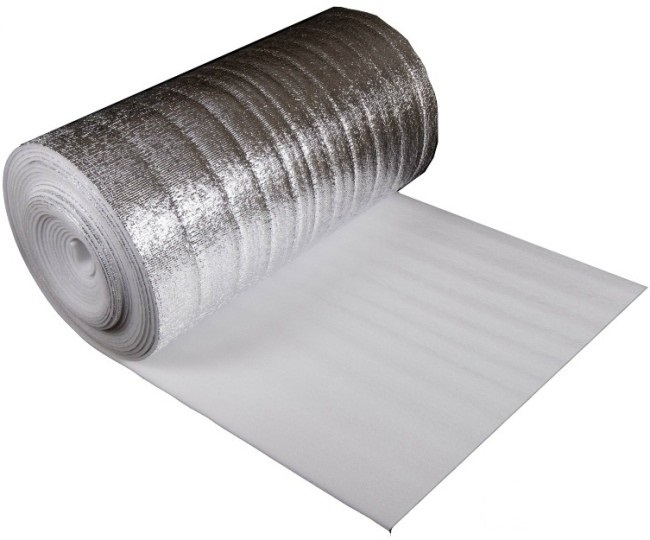 - Penofol. It is a foamed polyethylene coated with aluminum foil on one side (less often on both sides).It has high moisture resistance, according to the heat-insulating characteristics it is noticeably inferior to foam plastic. Very sensitive to even insignificant heat. It is not damaged by fungus, is not subject to rotting. When using, one feature should be taken into account - the foil side should be facing the warm room.