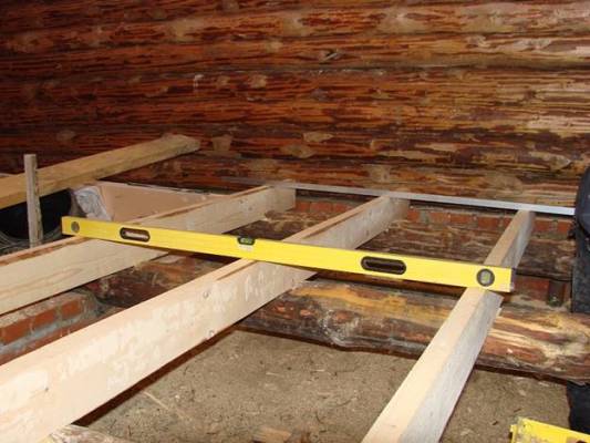 It is necessary to start laying from the highest section selected by the construction level. The layout of the lag is quite simple. The step must be kept constant - from 50 to 60 cm. It is necessary to observe horizontal position, as far as possible, if necessary, placing hard inserts resistant to moisture and fungus from below. The logs are fastened to the floor with screws in increments of 100-120 cm.