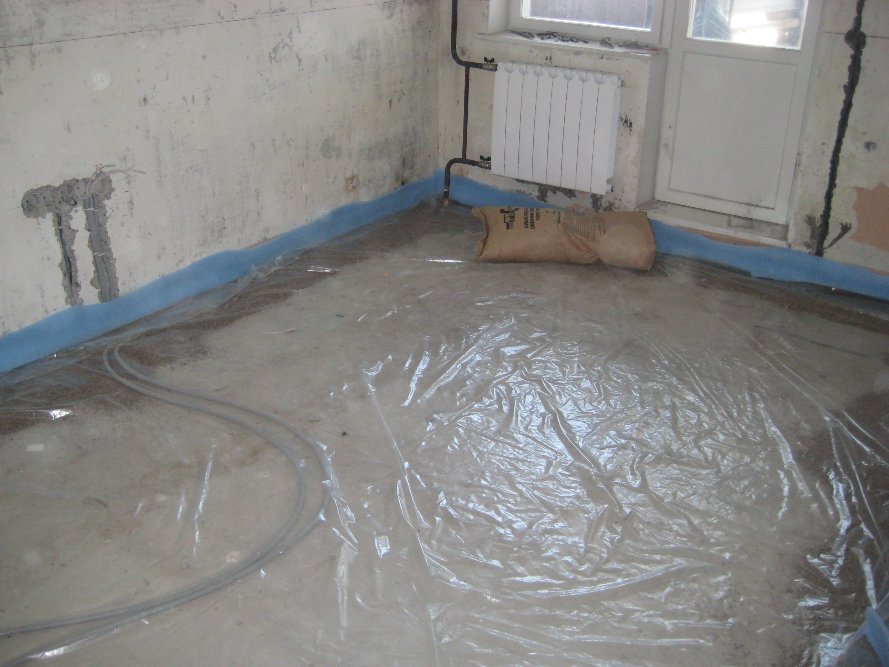 - Cover the floor with polyethylene and leave to dry for at least a month, occasionally moistening it with water.