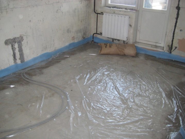 - Place a waterproofing layer on the subfloor. For this you can use a thick (from 200 microns) polyethylene film. The joints of the polyethylene strips are glued with a wide scotch tape, the edges are wrapped on the walls to the height of the finishing coating.