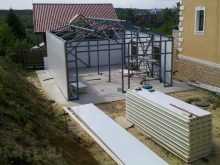 The last but most important step in the construction of the garage is the direct modular installation of the sandwich panels to the walls and roof of the frame. Most often, the sheets are fixed vertically, since the total height of the building does not usually reach 5-6 meters. The panels should not touch the floor, and even more so the foundation - between them lay a layer of waterproof material.