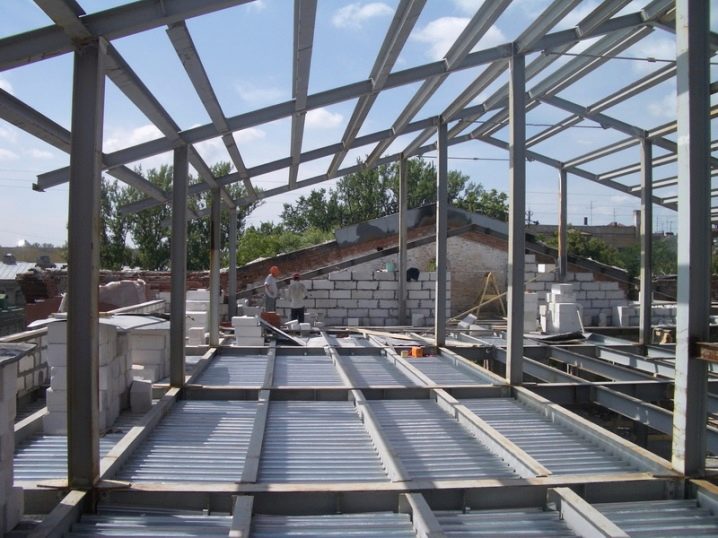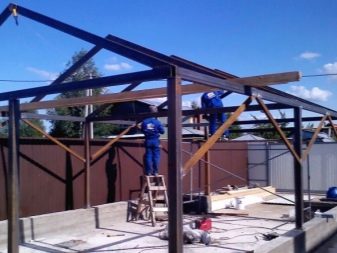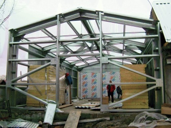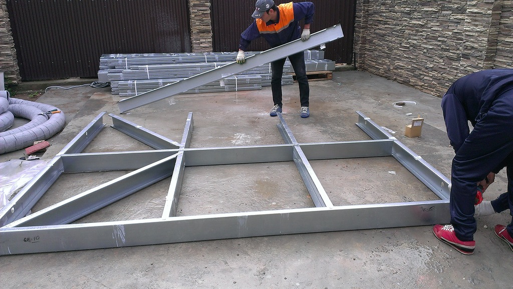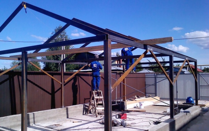 If there is no confidence in the reliability of the U-shaped profiles for connecting the vertical and horizontal bases, then welding and beams are placed on the bolts. However, it is the fastening systems based on self-tapping screws that are already provided for in the ready-made kits for assembling the garage, as they are easy to use and require a minimum of additional equipment.
