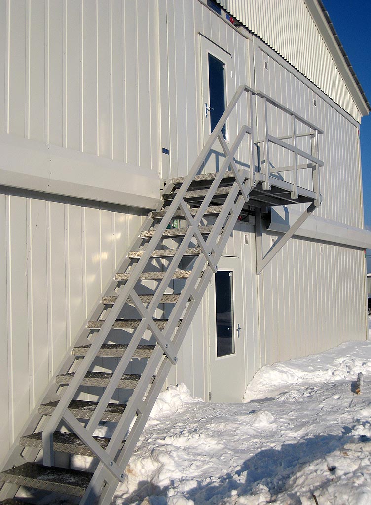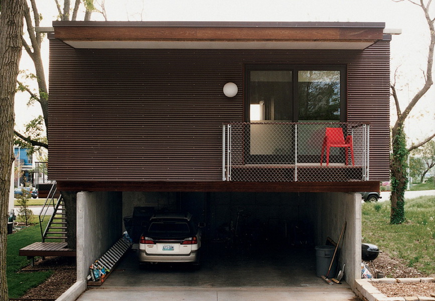 The stairs to the second floor often go directly to the house. In winter it is very convenient, but from the point of view of ecology it is not recommended to take such a step.so that exhaust gases do not get into the living space. It is impossible to arrange additional parking on the second tierAfter all, the prefabricated structure of sandwich panels is too light for such loads.