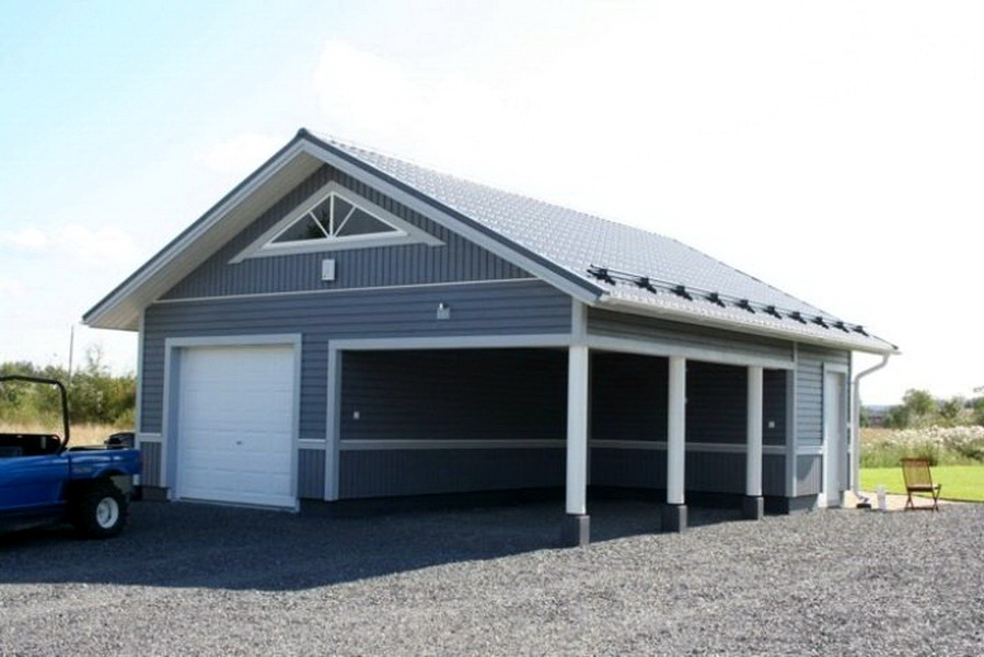 An unusual design is a variant of the garage in the style of American country, that is, a rustic house-shed. The garage is designed for two cars, but for one there is a fully covered room, and for the other - an open carport on supports and pillars. Such a project is convenient when working with dacha appliances, which are used every day, and it is faster to drive it out from under a canopy.