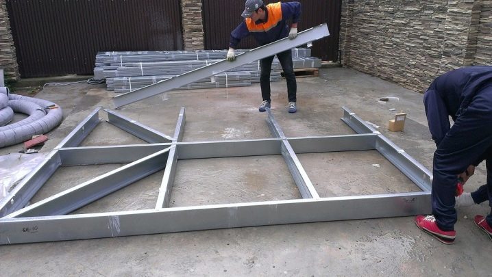 For a garage of sandwich panels after pouring the foundation, it is necessary to mount a frame on which metal sheets will be mounted.The design of the frame is not particularly different from those that are erected with their own hands when covering the walls inside the room with gypsum plasterboard. They take vertical and horizontal profiles, fastened together by a screwdriver and screws, as well as special jumpers and brackets.