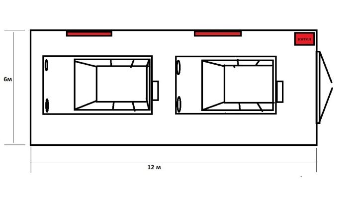 When the width of the increase in the garage is not possible, the construction is less convenient, but economical in terms of the occupied territory, where one machine stands behind the other. Yes, this is not so comfortable, especially if the first to work is to leave the one whose car is locked further from the entrance and you need to constantly negotiate. However, the undoubted advantage of a garage with an area of 12x6 or at least 12x4 meters is that both cars are always under cover and warm.