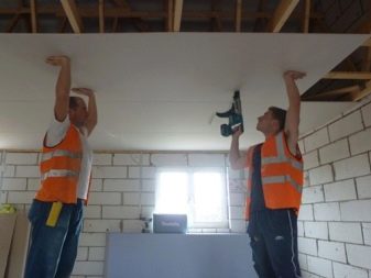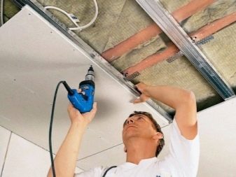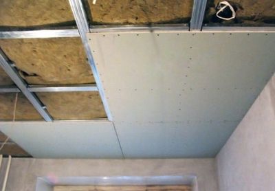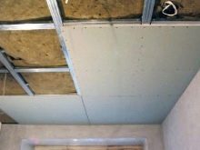 In place of the plastered ceiling came option from drywall. This finish is done quickly and easily by hand using galvanized profiles and low-cost plasterboard sheets. The material perfectly hides the irregularities of the ceiling and allows you to disguise communication. The damaged area is easy to replace, and the material itself is environmentally friendly and safe, but unstable to moisture and "eats" at least 4-5 cm in height of the ceiling.
