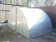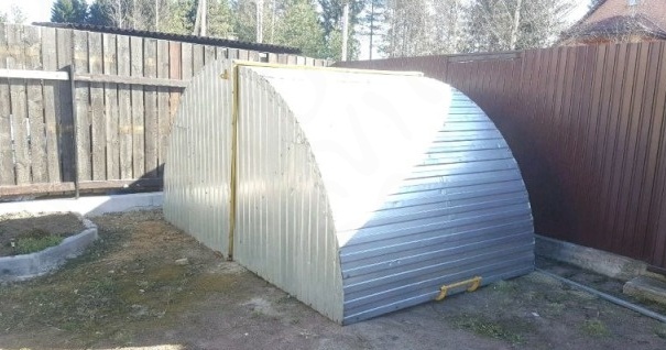 The standard construction of the garage is constructed from large sheets of metal profiles. The thicker the material, the stronger and more reliable it is. But it is necessary to take into account during subsequent dismantling and transportation to another place a large weight of material. The name "shell" refers to the form of construction. The garage resembles a multi-layered semi-circular shell, where due to the absence of corners, the site area is greatly saved.