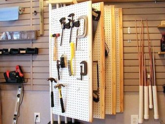 - Another popular way to use a wall is to arrange a metal or plastic panel with fasteners (hooks, brackets, etc.) instead of a rack, which will greatly save free space.