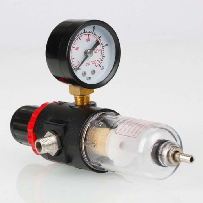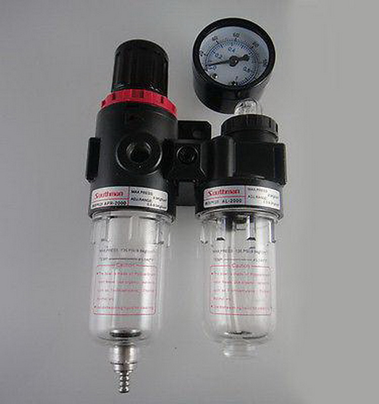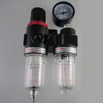 Principle of operation: the compressor draws air through the lower part, where the filter regulator and the on / off switch are installed. Regulator pressure limits are from two atmospheres to eight.