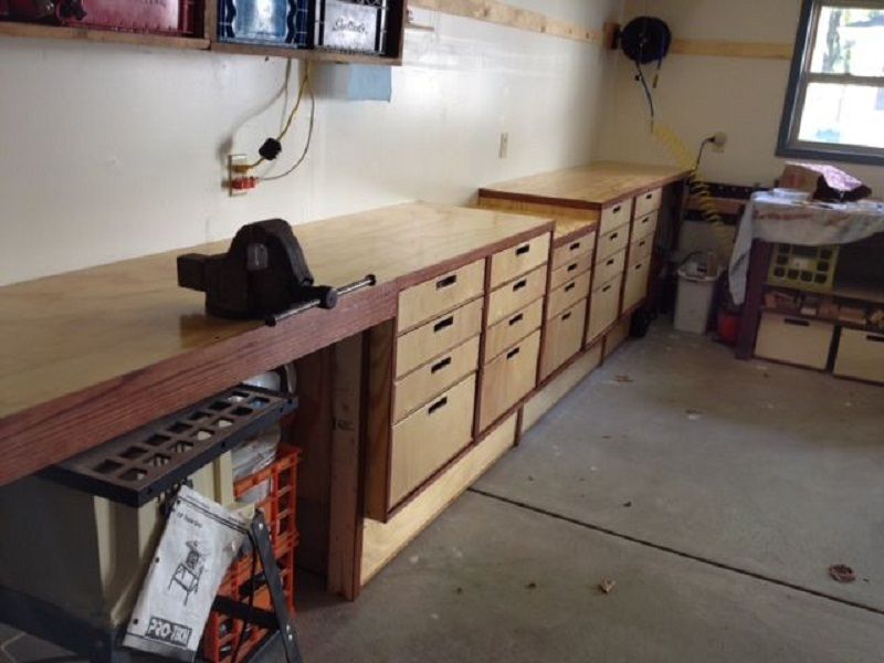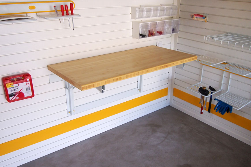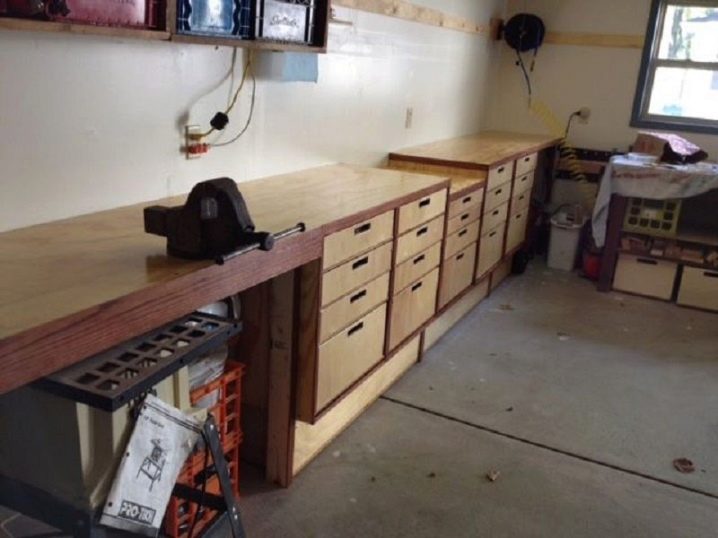 A large and comfortable workbench in the garage is its undeniable advantage. If in it to organize boxes for tools and parts, then it will turn into a universal place of work. Usually such a workbench is made to the entire width of the garage with boxes of various sizes.
