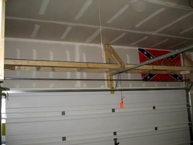 - Sometimes, to save space, shelves are fixed directly to the ceiling without using vertical supports on the floor. Hinged shelves can make room in the lower tier of the garage box, but they can not differ in special carrying capacity. You can fold on them oversized, but light lengthy slats, plastic corners, cardboard tubes, etc. You can also make them mesh - then you can hang something with hooks to them with hooks.