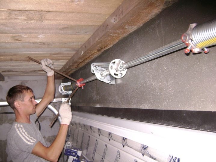 Torsion springs are used when installing the gate more than 8 m². Allowed 3 types of installation: standard, low, high. A big plus in the operation of this type of door is protection against the fall of the door leaf when the springs fail and low-noise operation, as with the option with a built-in wicket.