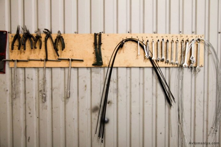 - If there is an additional room in the large-sized garage (utility room, electric switchboard), then on the surface of its door you can organize the storage of tools with the help of a hinged cloth or stuff holders in the form of different-size loops of plastic and ordinary ropes on it.
