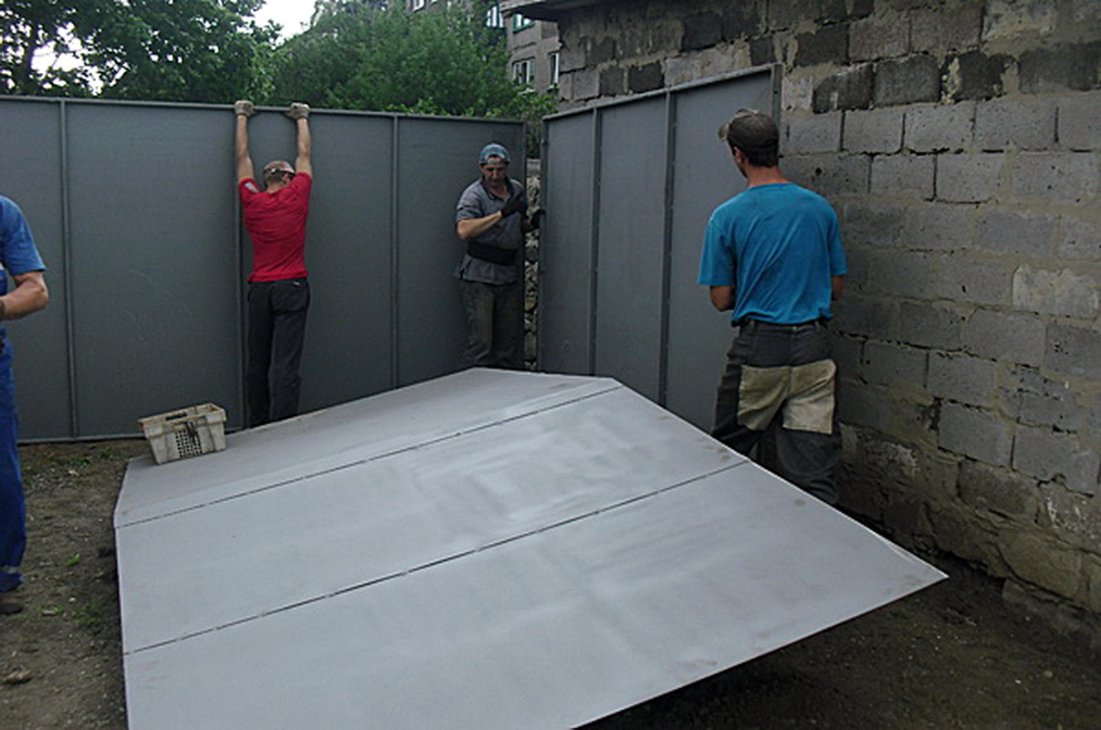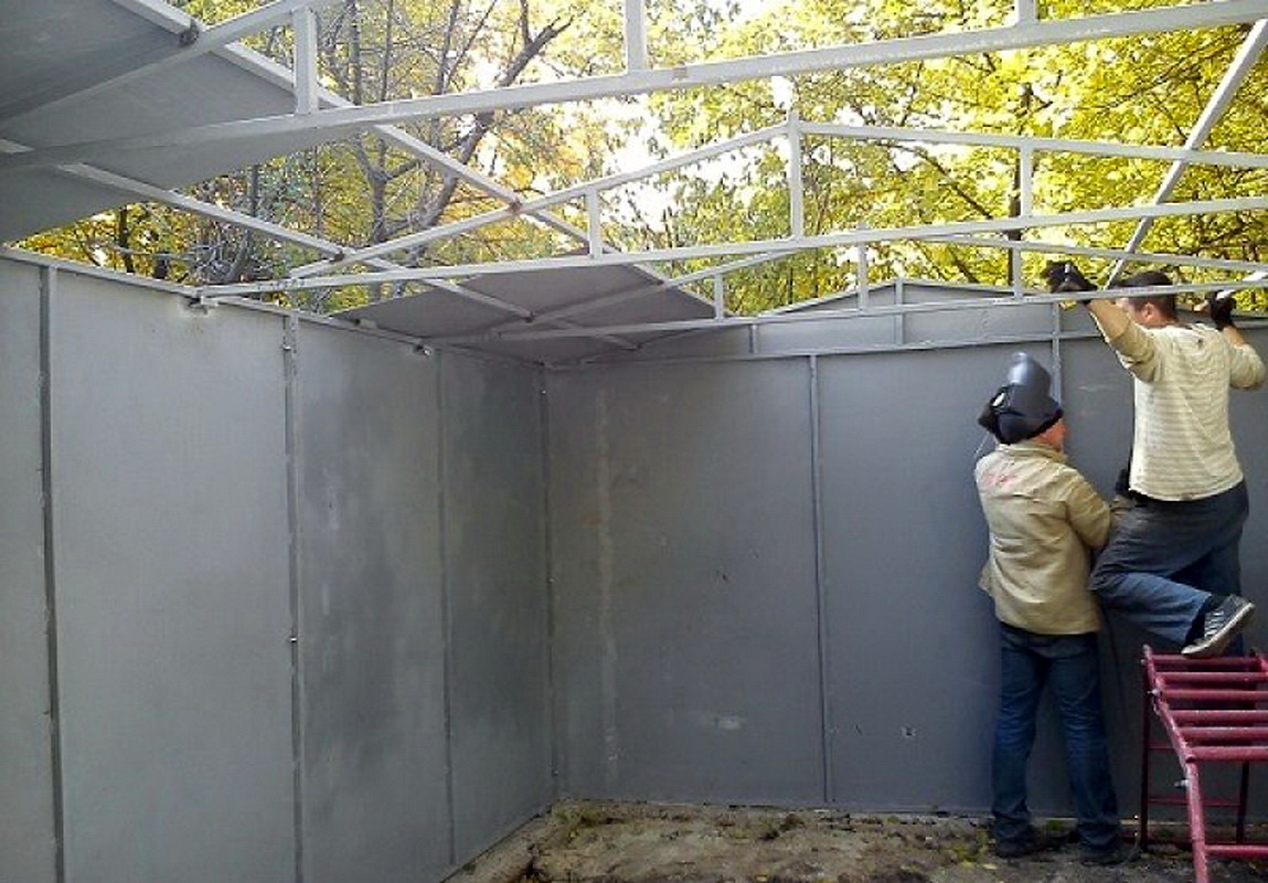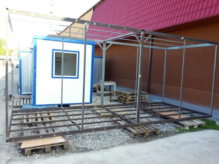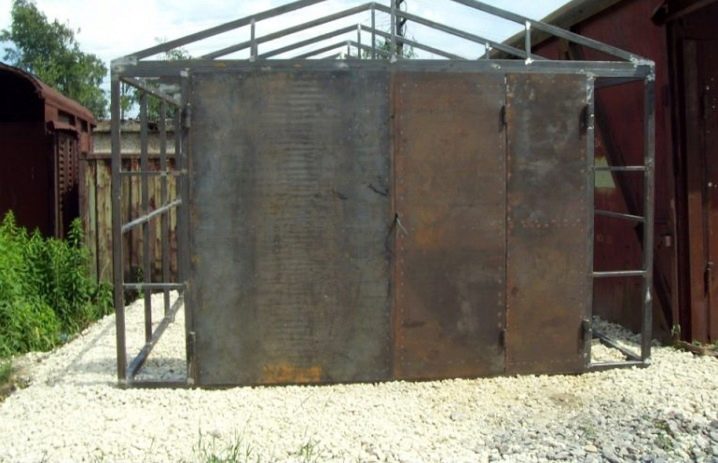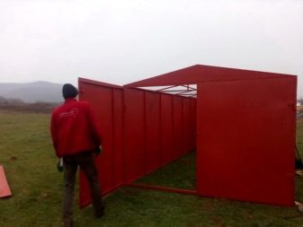 - Metal frame. This is the most common type of collapsible structures, which is considered the most versatile. It is characterized by ease of assembly and low cost. The steel profile is usually used as a frame, but sometimes a wooden bar or board is used. The metal structure is sheathed with iron sheets with a thickness of 2 mm and, if necessary, painted.
