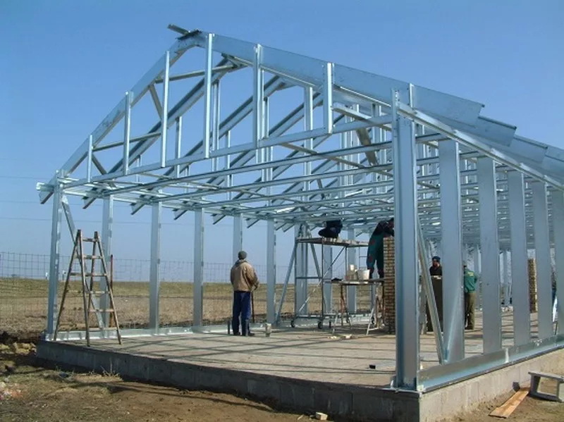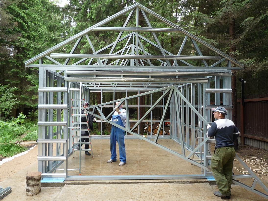 Then the roof truss is mounted and the roof is laid. The fastening of the frame elements is made with the help of bolts, nuts and metal screws.