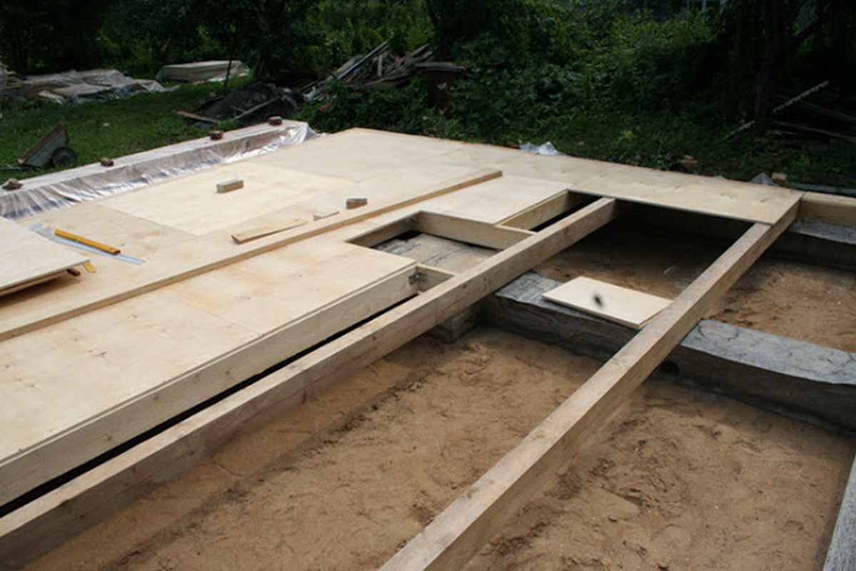 - Foundation formation Begin with the removal of the fertile layer and thorough tamping of the soil. Then, exactly repeating the size of the frame, a trench is dug, the depth of which should not exceed 50, and the width - 60 cm. The bottom of the trench is covered with sand and carefully tamped. The thickness of the layer is usually 20 cm. Next, a plywood formwork is installed with a height of 20 cm above ground level.