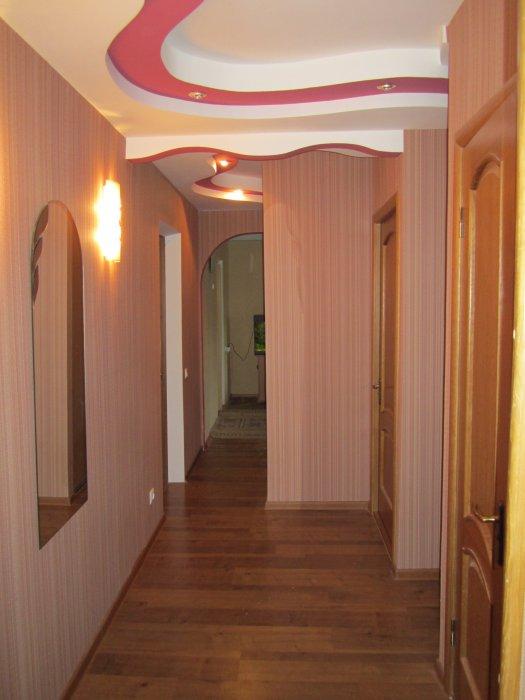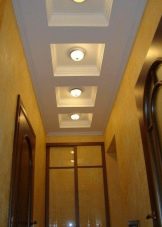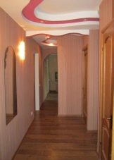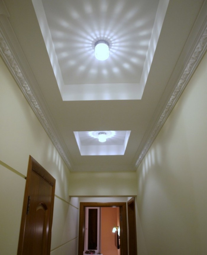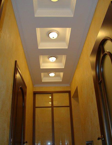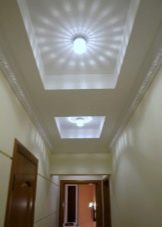 Returning to the corridors and hallways, it should be emphasized that they are best manifested monochrome ceilings of bright colors, continuously highlighted around the perimeter. Such solutions help to get rid of the excess gloom and heaviness of these rooms, almost always remote from the main windows in the house. Sources of light - most often point or tape. To increase the attractiveness of the finish helps choice of arches, arches.