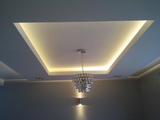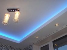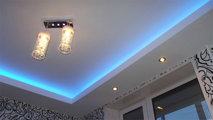Lighting for a two-level ceiling is very important. Almost always they use LED light sources. Their attractiveness is due to a soft and uniform glow, the ability to increase the visual depth of the ceilings and create the feeling of “floating in the air” in the observer. By varying the light power and the color of the lamps, it is possible to create a truly unique lighting that you will not find anywhere else. You can increase the brightness due to the introduction of lamps or floor lamps. The location of the built-in lighting means is supposed to make the light uniform throughout the room.