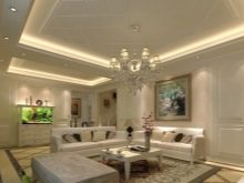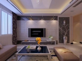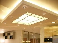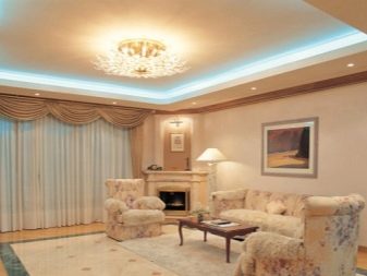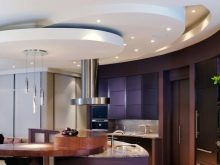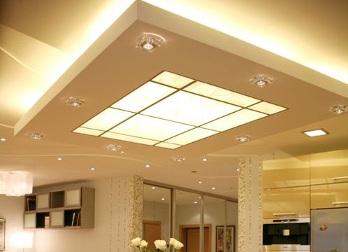 In the loft and country setting is recommended to use beams.The classical type of a two-level ceiling is ideally compatible with light coloring, accurate geometry. Chandeliers of attractive shapes are used as lighting devices. But much better for this solution is suitable high-tech, because it allows you to apply a strict rectangular shape. Highlights of the ultramodern interior can help lamps made of metal, painted with blue or purple paint.