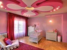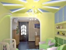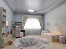 The ceiling in the nursery has its own characteristics. There you can not visually overload the room - the smaller and lower it is, the calmer the design should be.Adults can safely transfer the appearance of massive figures painted in different tones, but such things are often perceived by children as a kind of threat. The only justified use of large parts is the distribution and underlining of zones. Soft spring shades are perfect, the light should be milky or slightly yellow.
