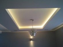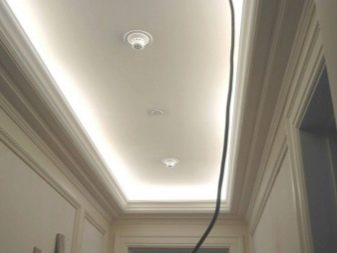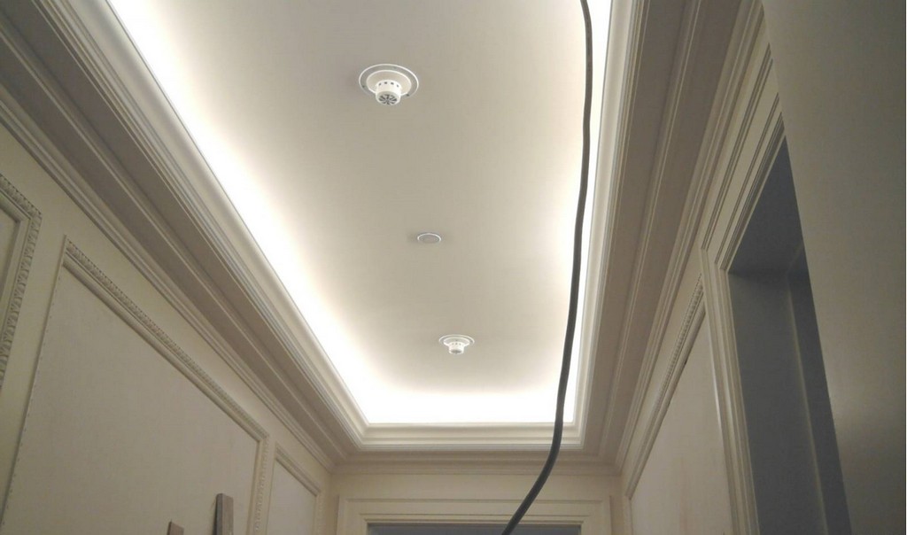 If you refuse the eaves for lighting, you need to mount a special profile on the walls, held by nails. This element forms the second horizontal layer. Identical profiles are placed on the ceiling, holding it with anchor wedges that define the configuration (it will not always be a rectangle). The use of illuminated eaves implies placing an LED strip with a self-adhesive layer inside. The eaves is a special shelf that extends beyond the planes of the second levels,in fact, this is an extension of the horizontal profile by 50-100 mm.