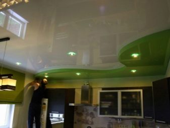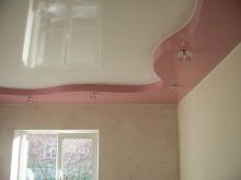 It is not at all necessary that the decorative elements be inseparable: pink-colored “petals” separated from each other on an ordinary white base will also look extraordinarily beautiful and elegant. In the opinion of some designers, glossy ceilings are best complemented by a sinuous colored construction in one of the corners protruding above the plane. The photo shows an example of such a design using green.