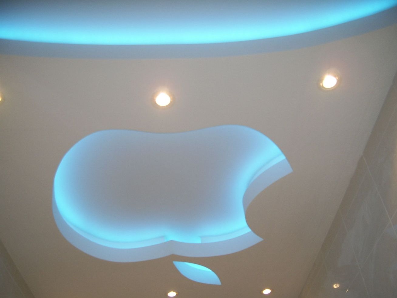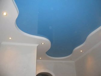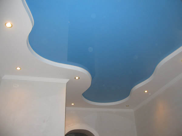 A blue ceiling with a central luminaire and lighting around the perimeter may look charming and unusual.To emphasize the specificity and attractiveness of such a decision, to connect it with the rest of the room, it is desirable to finish the walls in the same range. A simple white ceiling can be varied with an arc-shaped strip raised above the main plane. It is desirable to integrate light sources into it. Not badly similar design reception is combined with the light walls covered with wall-paper in a vertical strip.