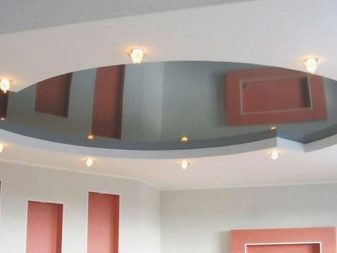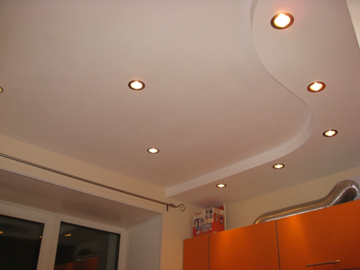 Two-level suspended ceiling can have a lower level of various geometric shapes. Since the inner layer is less ventilated, it is necessary to use a moisture-resistant material. A curb around the perimeter of the wall should be applied over the plastered surface. The difference between the tiered levels can also be expressed in the arrangement of the drywall islands, which facilitate the upper distribution of zones in space. In this scheme, the second level is occupied by recessed lights or light strips.