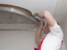Drywall is relatively fragile, any turning effort can destroy it. If the material needs to be bent, it is moistened with a wet sponge until the sheet becomes pliable. Thus, it will take the form of a prepared profile. It is necessary to exercise caution in working with wet drywall, as the soft canvas is easily torn. Sheets tightly planted in profile and secure with screws, connecting with the lower tier.