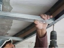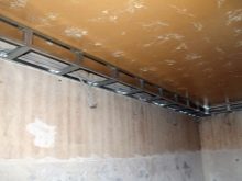 Guides are fixed by markings on the walls. Profile shelves should be turned down; they will hold the box.From the profile do racks-suspensions, cutting it in parts. They are inserted into the guides and mounted with a half-meter frequency. Making blanks for the bottom box, take into account a few centimeters for mounting LED strip. The shelves of the lower profile must look upwards, the prepared elements are inserted into them and fixed with self-tapping screws.