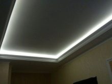 Having prepared the materials and tools, you can start working.Ceiling design hides all the flaws of the ceiling. If the old finish is held firmly, it can be ignored, but the crumbling surfaces should be well cleaned, otherwise construction debris will be seen on the illuminated stretch fabric.