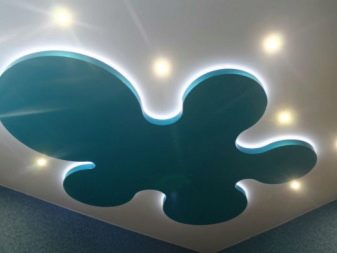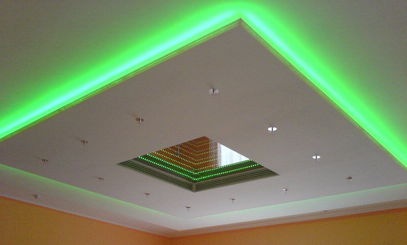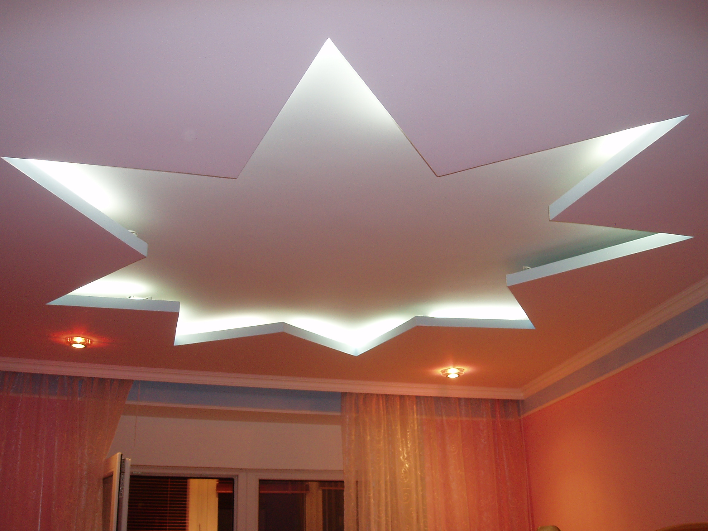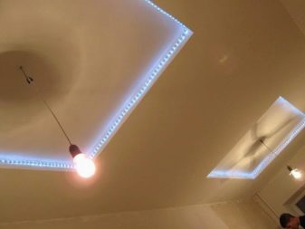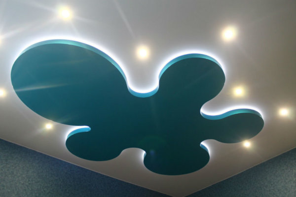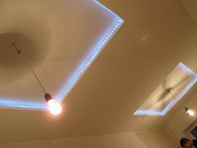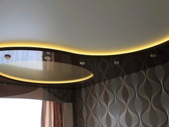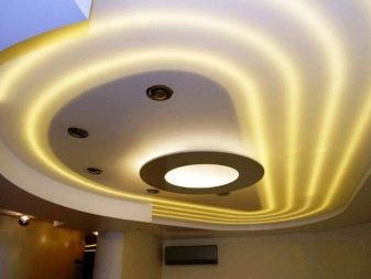 Ceiling lighting is available in two versions: hidden and open. When hidden - lights are not displayed, they are hidden in a plasterboard construction, the light coming from no one knows where it seems to be mysterious. Open lighting allows you to leave any light visible.