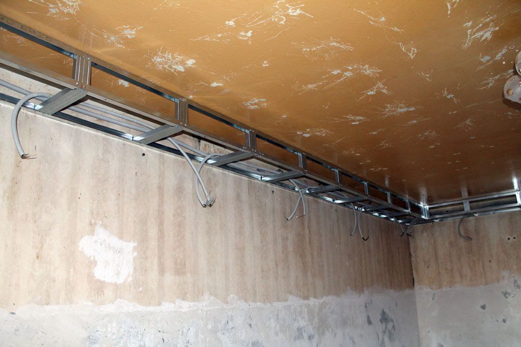 On the basis of the frame make markup for electrical appliances. Profiles are installed so that their length is 5 mm less than the frame base, and they themselves are not located too close to the lamps. Further suspensions are mounted (they are able to withstand up to 40 kg), this is paid attention to when their number is calculated. Installed profiles using screws. Inside are all the elements of the wiring, but the lights themselves are not yet installed.
