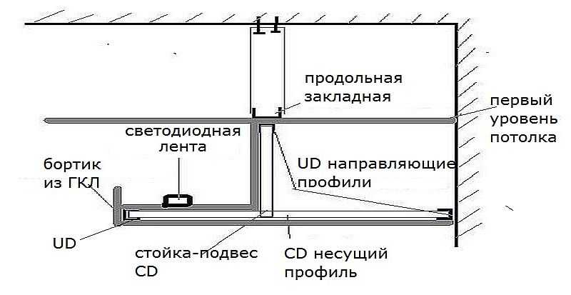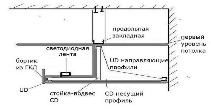 To create a multi-level ceiling, you will need a frame, a special box that allows you to send sheets of drywall during fasteners.