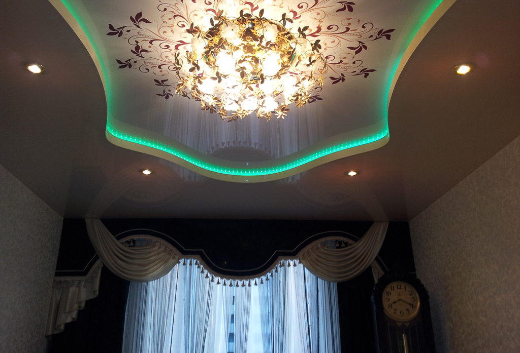 The two-level ceiling with lighting is combined with a stretch canvas of various colors, matte or glossy structure. Such a variety of execution of the ceiling design makes it possible to create a design for every taste with different styling. The ceiling will not only merge with the interior, it will become its accent and distinctive decoration.