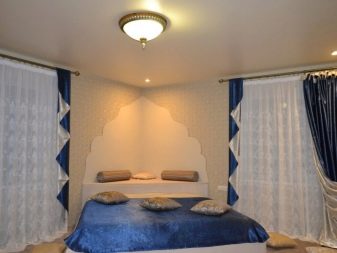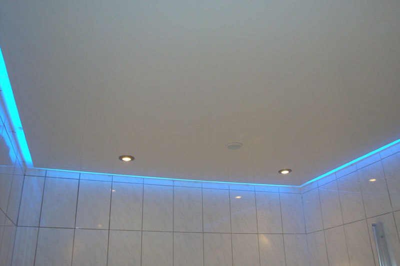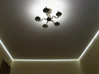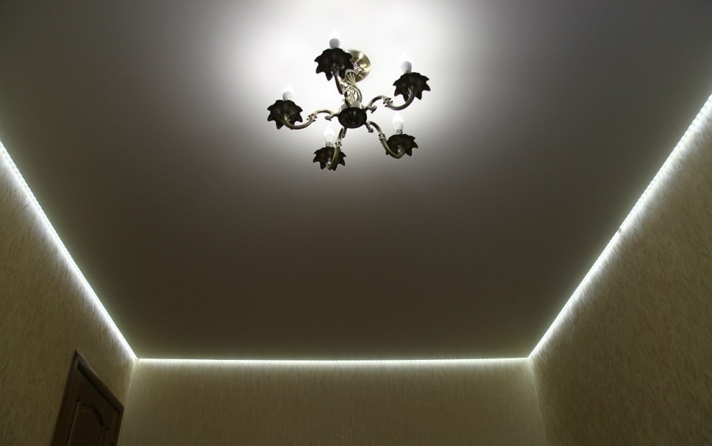 The backlighting, mounted in a plasterboard ceiling, can be open or hidden. For open lighting it is necessary to provide holes in the ceiling or a suspension for a chandelier. Hidden lights are located in special niches. Due to this, the lighting is very soft, scattered, mysterious.