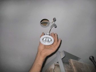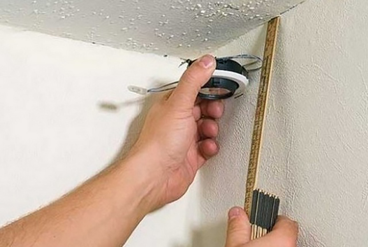 - For installation spotlight the marking is made, and then the holes are cut. The advantages of this type of lighting include the original design and ease of installation without the additional involvement of specialists. Disadvantages: the need for rework wiring, not very intense light,but at the same time quite large costs of electricity.