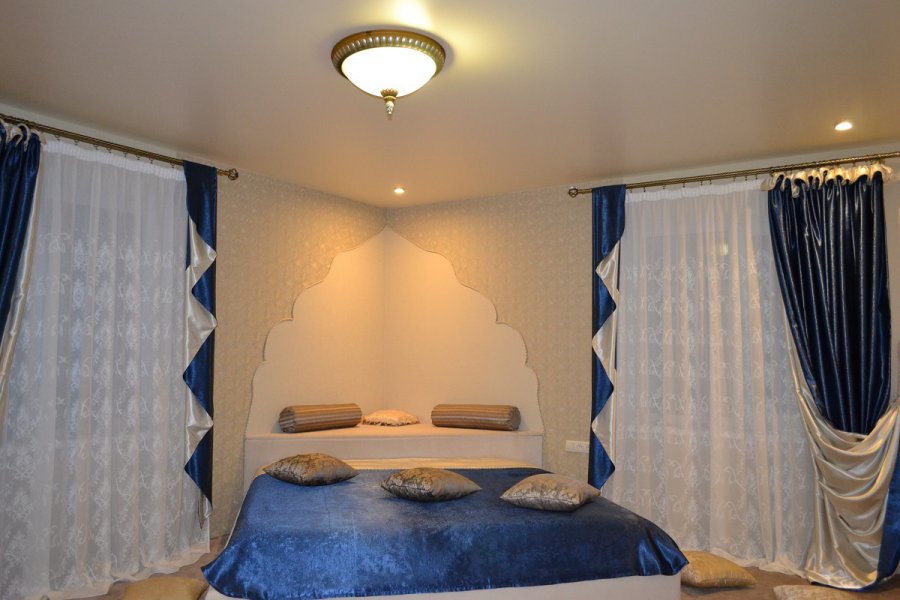 When installing a single-level gypsum ceiling can be used as built-in spotlights, and classic chandeliers. You can beat and create a star on the ceiling with luminescent paint. They will be invisible in the daytime, but in the evening and at night they will effectively decorate the interior, adding originality and mystery to it.