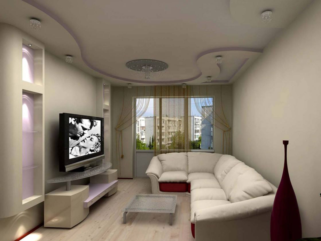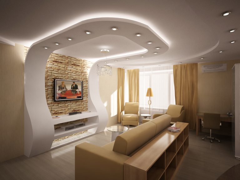 The times when typical flats were typical ceilings are far in the past. Modern technologies and innovative finishing materials allow you to create incredible designs with unique lighting for the decoration of the ceiling space.Each owner is free to choose the option of decorating the living room to the soul and in accordance with their financial capabilities. The most affordable and at the same time effective option is a single-level plasterboard coating with a slight lowering of the ceiling level by 10-15 cm.