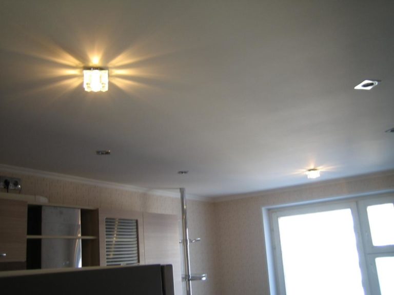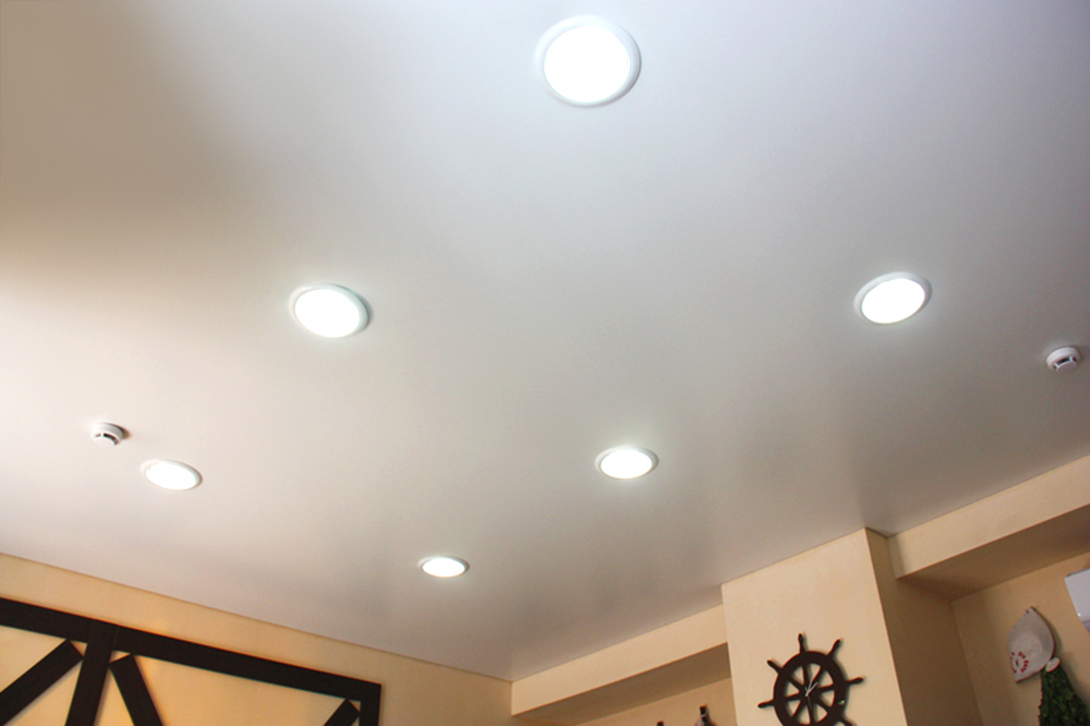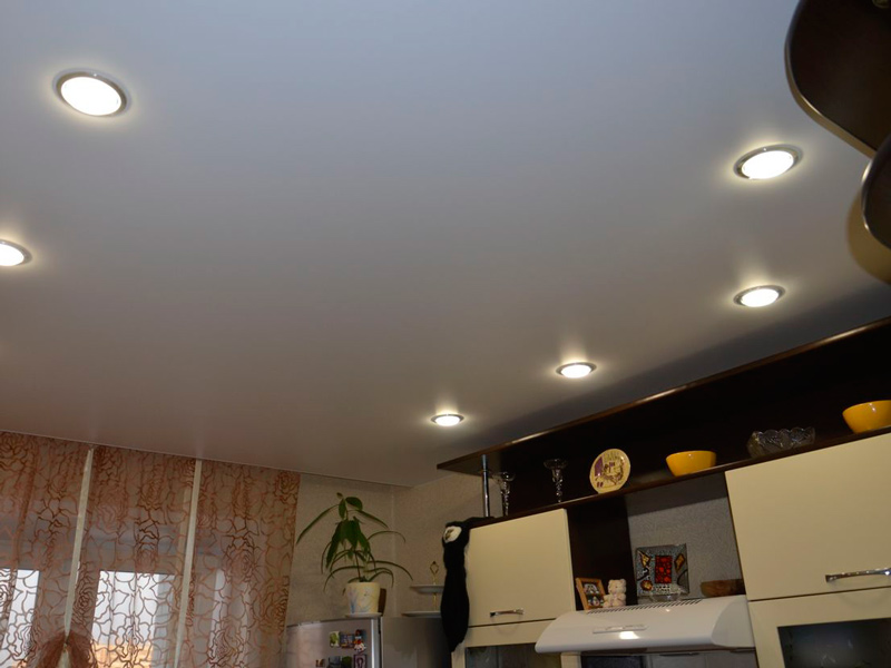 Single-level ceilings with built-in spotlights are ideal for placing any quadrature.