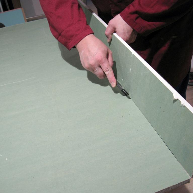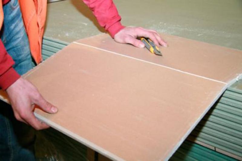 - When you mark the lines for cutting, attach a ruler to the line, and already along it with a knife cut the top layer of drywall. Next, bending the sheet along the cut line, gently break it.